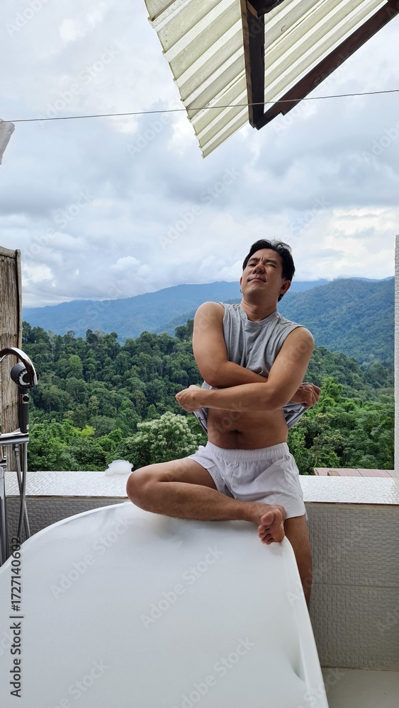 Handsome Man Unwinding in a Soapy Bathtub with a Stunning Mountain Vista