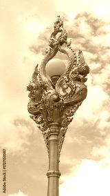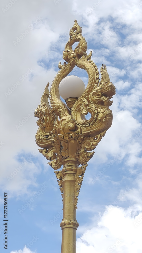 A gold colored street light with a bulb on top