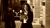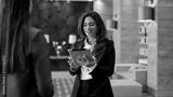 Businesswoman helping customer or colleague in modern hotel lobby, using digital tablet for assistance or information