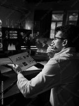 Professional analyst reviewing digital data dashboards with futuristic projections. Concept of data analytics, decision making, fintech strategies, and digital transformation. Collage
