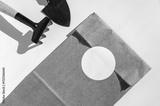 Gardening tool and brown paper bag with blank circle label on white background