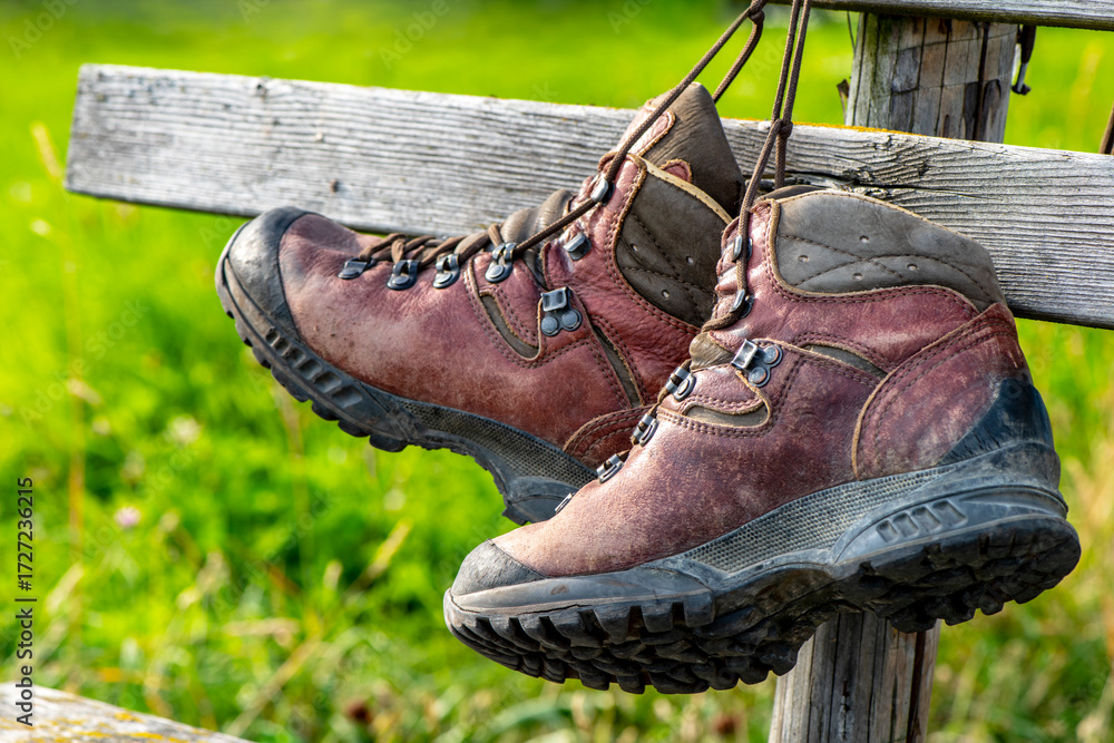Ein Paar Wandersteiefel hängen nach einer Tour an einem Zaun - FOTOMONTAGE