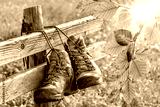 Ein Paar Wandersteiefel hängen nach einer Tour an einem Zaun - FOTOMONTAGE