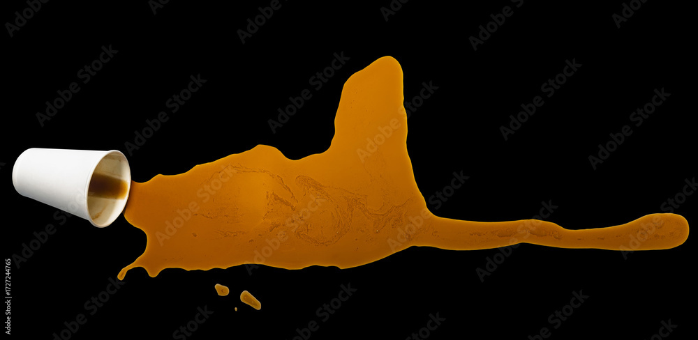 Spilled coffee from white paper cup creating dramatic brown liquid puddle on black background isolated view