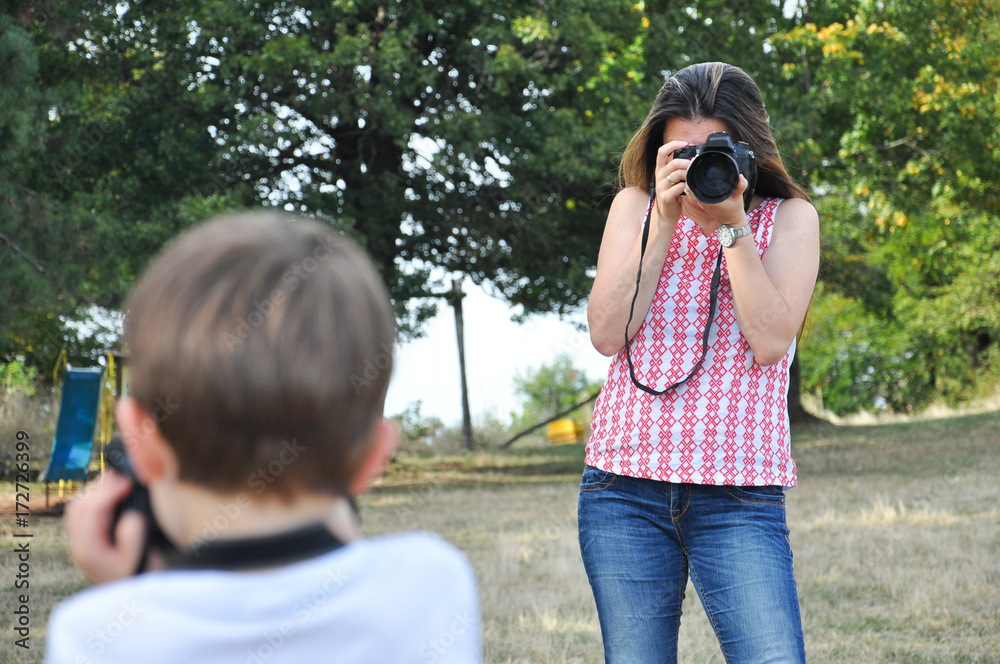 Mom make photos of her little son. Woman photographer taking photo of little boy