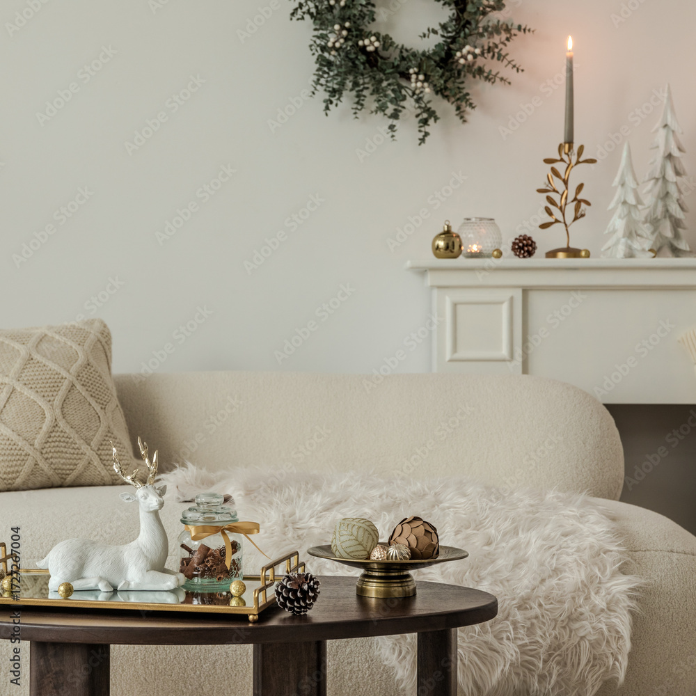 Christmas compositions on the wooden coffee table with tray and decorations. Close up. Christmas is coming. Home decor.