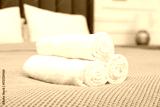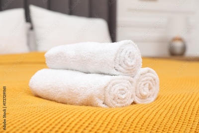 Rolled white terry towels on bed indoors, closeup
