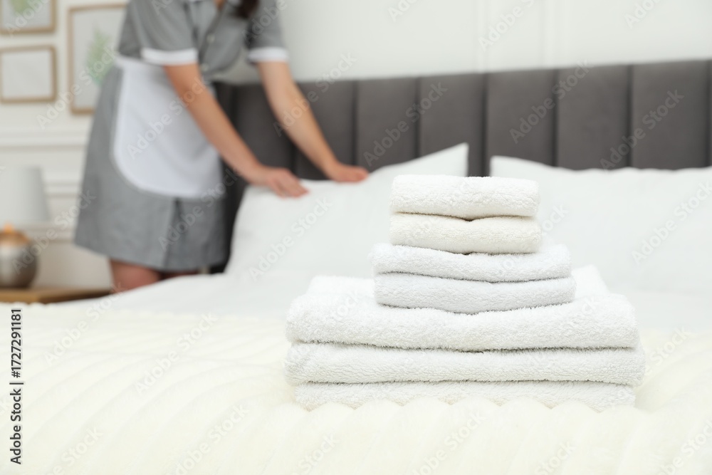 Chambermaid working in hotel room, focus on stack of terry towels on bed