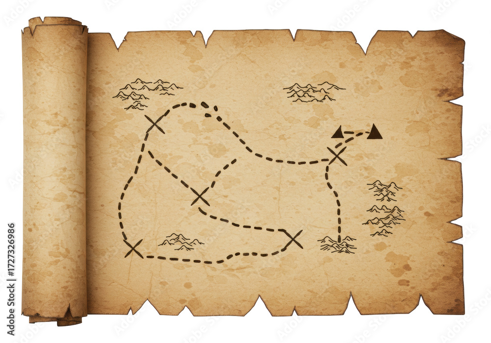 Isolated treasure map scroll, pirate parchment document for adventure game with X marks the spot