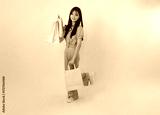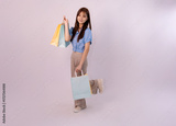 A cheerful young woman in a blue top and beige pants posing with pastel shopping bags, conveying casual fashion, modern lifestyle, and a positive shopping day