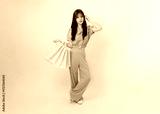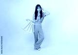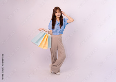 A cheerful young woman in a blue top and beige pants posing with pastel shopping bags, conveying casual fashion, modern lifestyle, and a positive shopping day