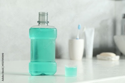 Bottle and cap of mouthwash on white counter in bathroom. Space for text
