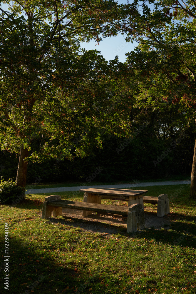 Wooden picnic table with benches on both sides stands in the park under warm sunlight. Early autumn atmosphere with golden leaves and soft natural light.