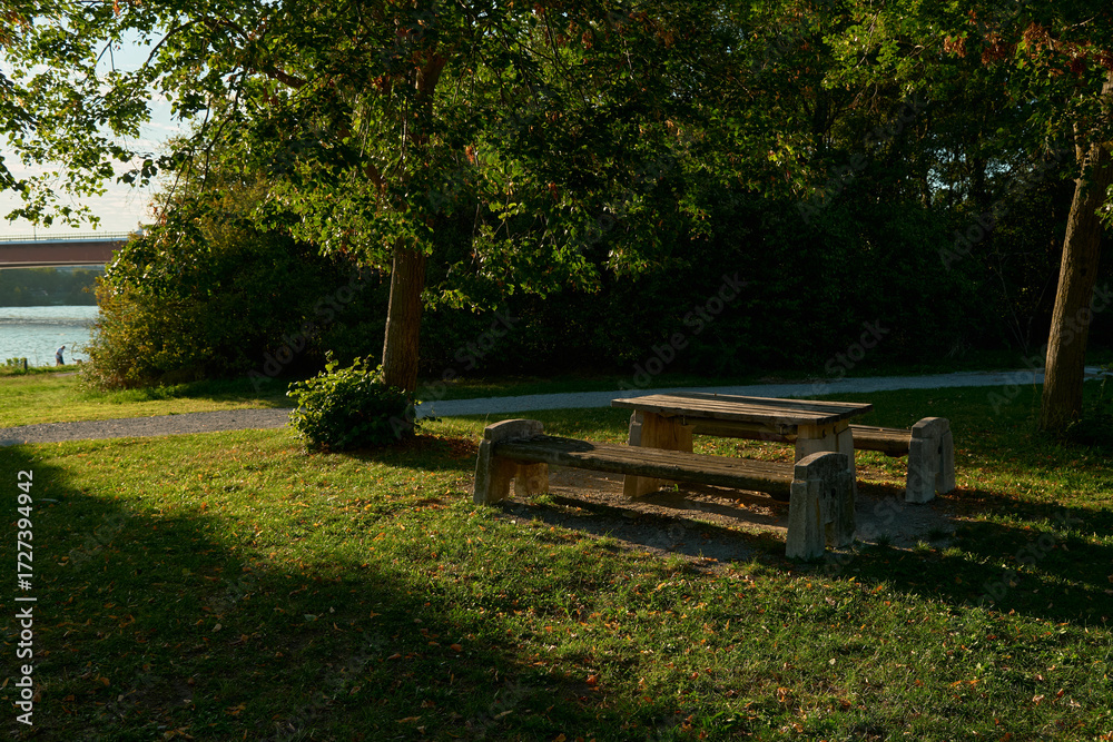 Wooden picnic table with benches stands under warm sunlight on the riverbank. Early autumn scene with golden grass, calm water, and peaceful natural atmosphere.