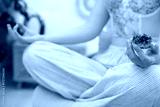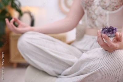 Woman with beautiful amethyst gemstone meditating indoors, closeup