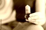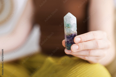 Woman with beautiful fluorite gemstone indoors, closeup. Space for text