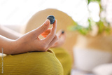 Woman with beautiful gemstones meditating indoors, closeup. Space for text