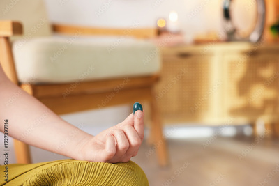 Woman with beautiful gemstone indoors, closeup. Space for text