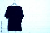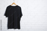 Hanger with black t-shirt against white brick wall. Mockup for design