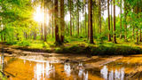 Beautiful forest with green trees, creek and bright sun