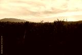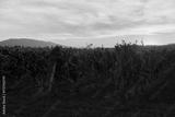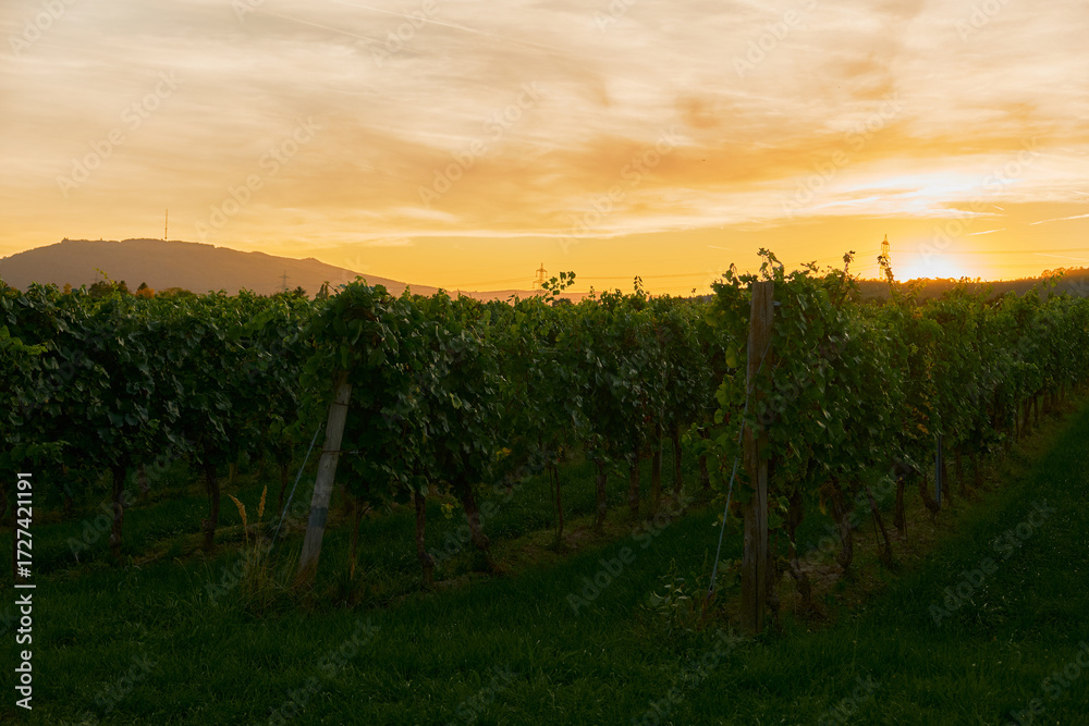 Horizontal shot of vineyards with bright yellow sunset sky. Green grass grows between vineyard rows, highlighting the textures of the landscape and serene natural beauty.