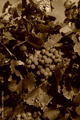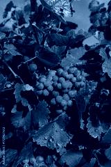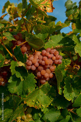 Vertical close-up of large, juicy pink grape clusters among vineyard leaves. Captures autumn harvest vibes, textures of grapes and leaves, and serene vineyard atmosphere.