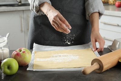 Making delicious apple strudel. Woman sprinkling flour onto dough at grey table in kitchen, closeup