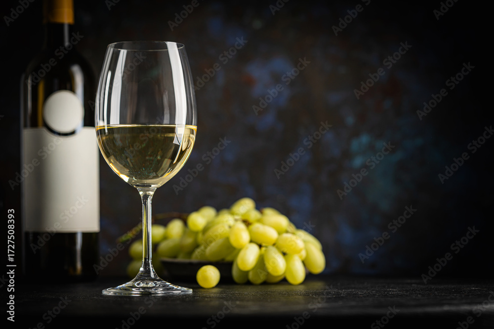 A dark, elegant still life of white wine in a glass with wine bottles and fresh grapes in the background. Perfect for wine-themed compositions