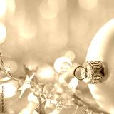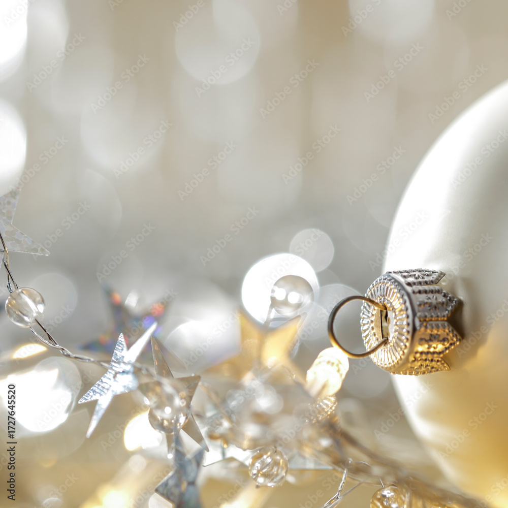 Christmas decorations on blurred glowing festive background. Holiday season concept, Christmas baubles, cards, winter celebration, joy, warmth, festive atmosphere, seasonal campaigns themes.