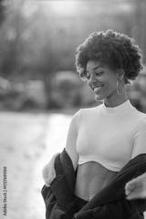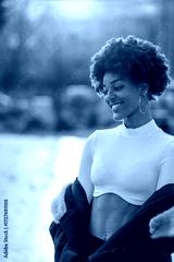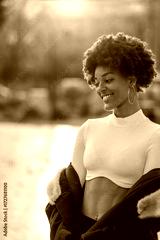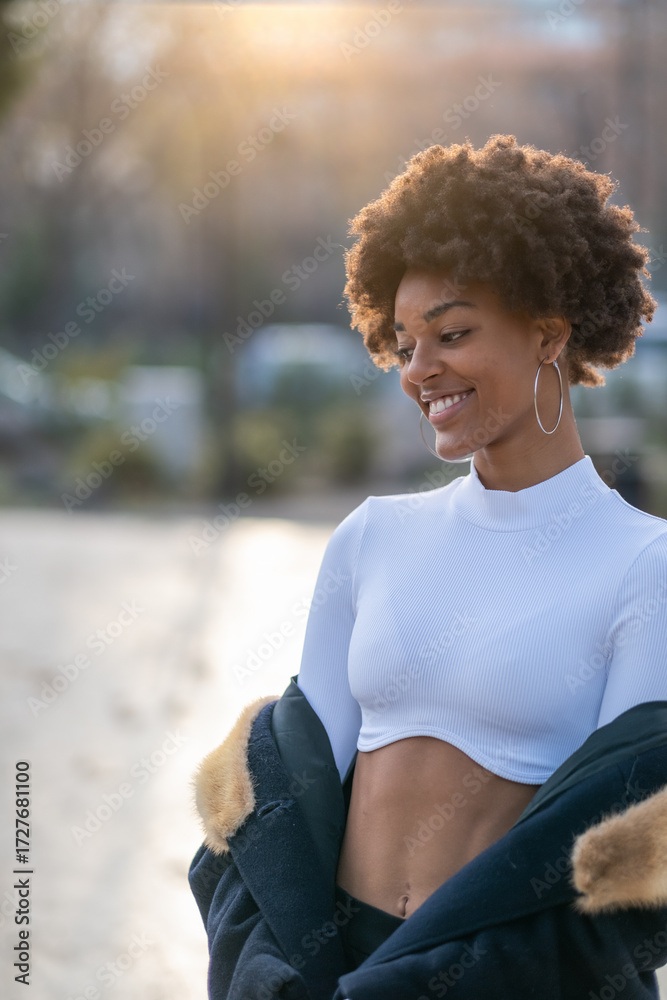 Joyful portrait of a young woman with natural afro hair, hoop earrings and a white crop top, smiling under warm sunlight in an outdoor urban setting