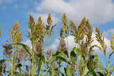 Ripe millet grows against a blue sky. Delicate clouds can also be seen in the background. The grains of corn are visible.