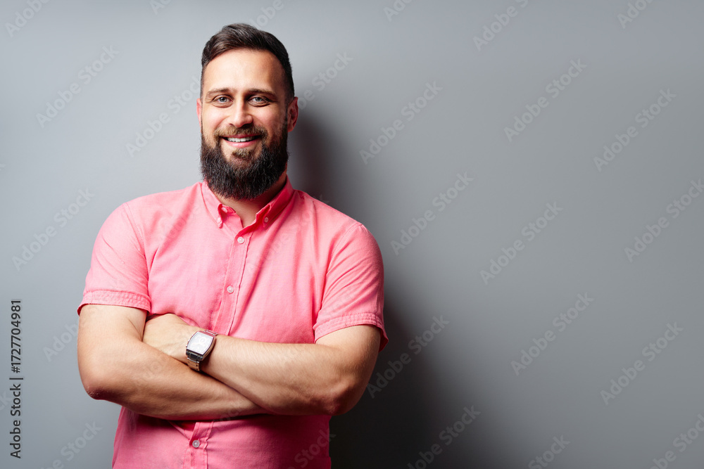 A smiling man with a beard, wearing a pink shirt, stands confidently against a gray background, portraying positivity and approachability.