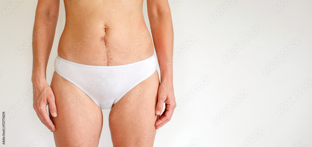 Woman's body with a scar on her abdomen from a surgical suture five months after gynecological surgery (hysterectomy), or after giving birth by cesarean section, close-up, copy space.