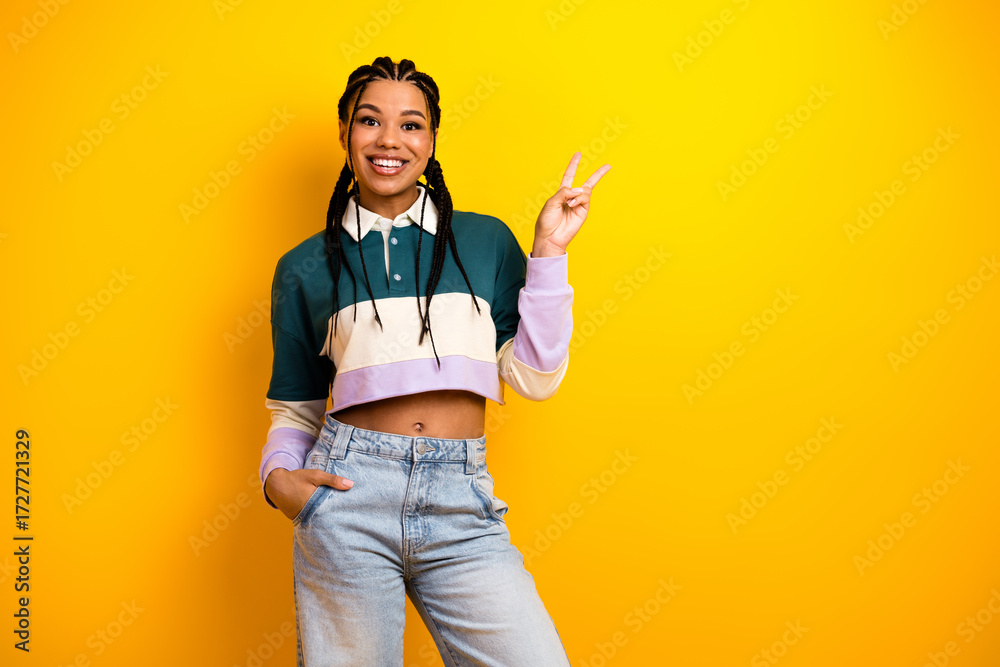 Young woman with braided hair in casual outfit is posing against a yellow background while showing a peace sign