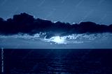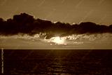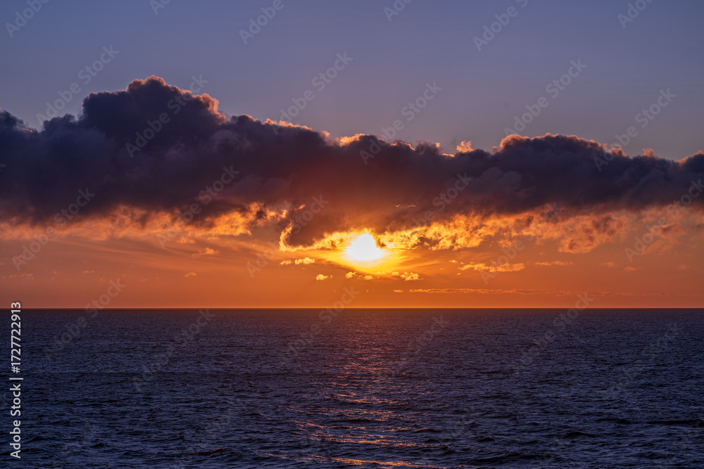 Dramatic ocean sunset with glowing clouds.