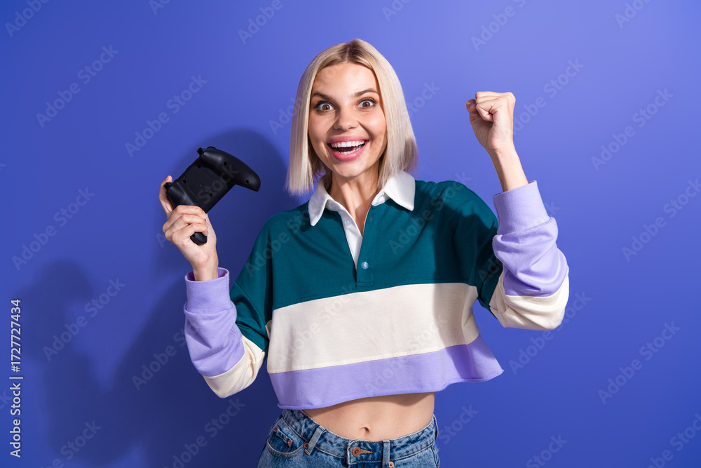 Happy young woman celebrating victory with a game controller in casual style against a colorful purple backdrop