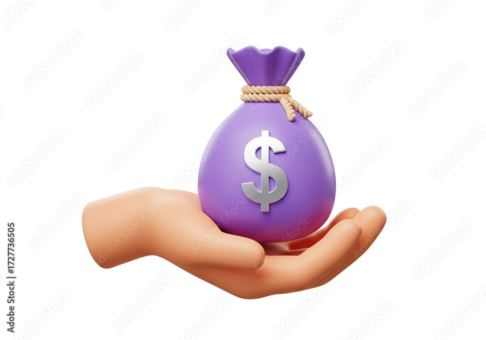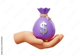 Cartoon hand holding a purple money bag with dollar sign isolated PNG, financial concept