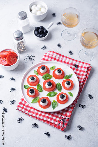 Caprese salad in the form of eyes of monster in a plate for Halloween holidays