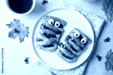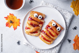 Puffed cakes with raspberry jam in the form of mummy for Halloween holidays