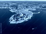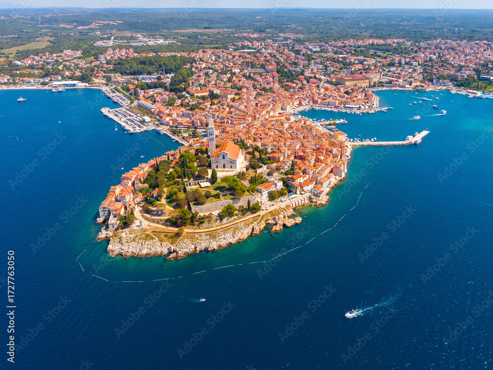 Aerial drone shot of the city of Rovinj on the Istrian peninsula, a popular tourist destination along the Adriatic Sea