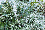Close-up of green leaves on a beautiful shrub with silvery leaves in sunlight.
