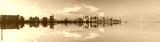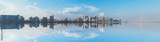 Urban Skyline Reflection on Water with Blue Sky and Clouds Panoramic View Featuring Buildings and Bridge Architecture Mirrored on the Calm Surface