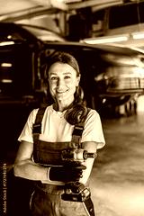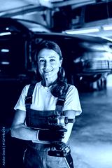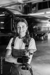 A confident female mechanic confidently wields a power tool while working in a bustling modern auto repair shop