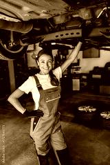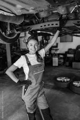 A skilled female mechanic confidently poses in a garage, showcasing her expertise in automotive work.
