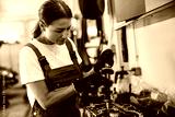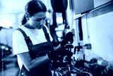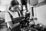 A skilled female mechanic meticulously repairs engine parts, showcasing exceptional professionalism in her work