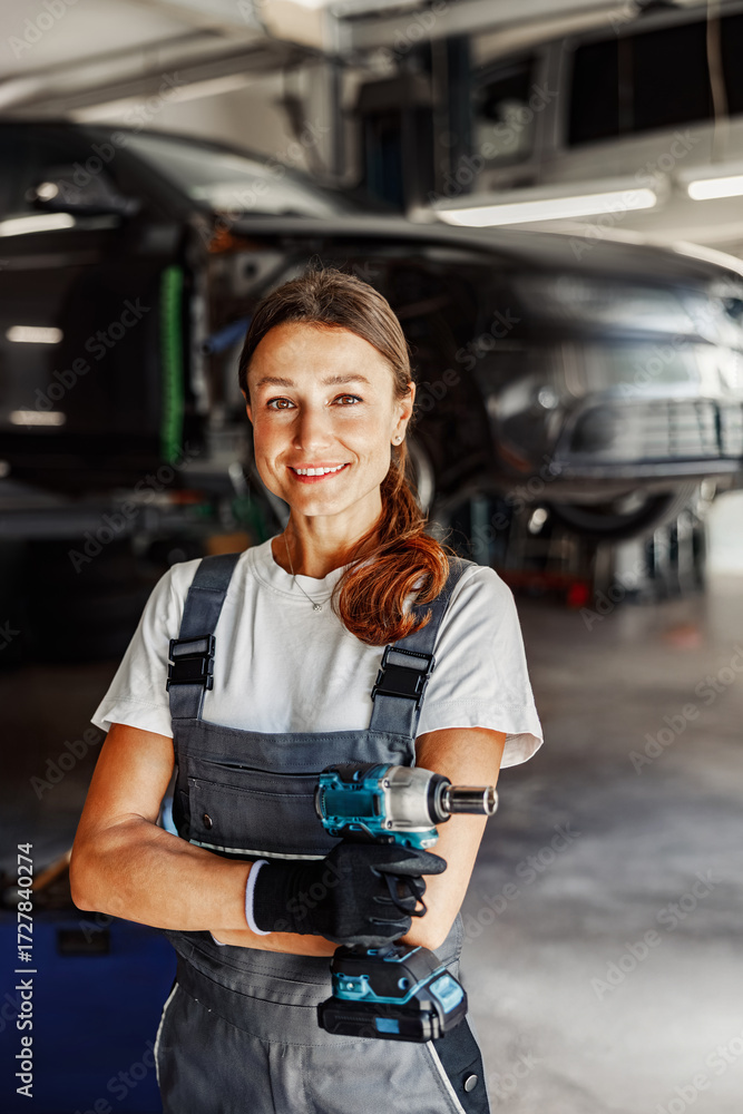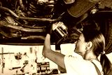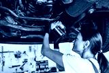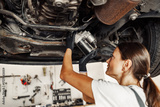 A skilled woman works under an automobile, showcasing her expertise in automotive repair and commitment