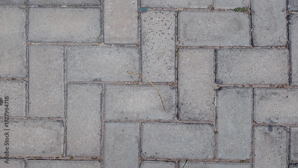 Calçada com blocos de concreto em zigue zague, piso de pedras retangulares inter-travados