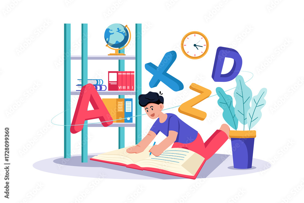 Boy Learning Alphabet With Book On White Backdrop And Pink Letters Around Him