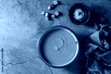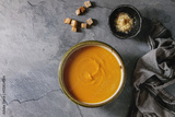 Bowl of vegetarian pumpkin carrot soup served with saffron salt and croutons on textile napkin on dark gray kitchen table. Top view with space