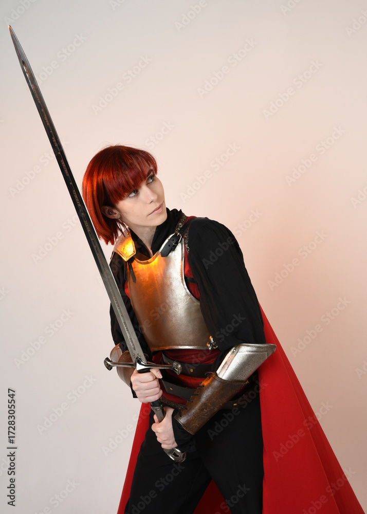 portrait of Fantasy warrior woman model, historical medieval armour costume with red fairytale cloak, strong fantasy knight holding sword weapon, epic pose. isolated cinematic studio background.